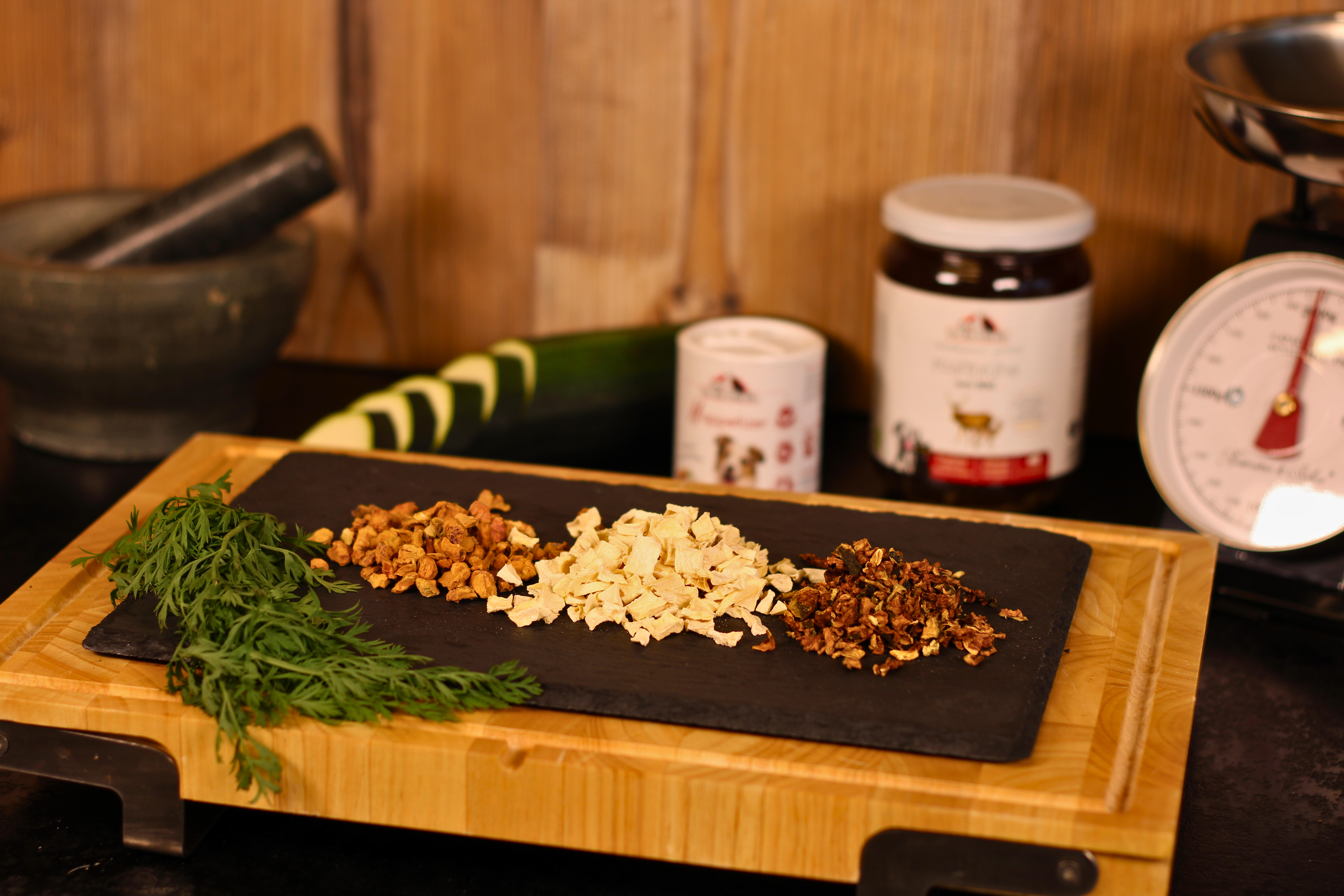 - getrocknete BIO-Apfel Flocken, ideal als Ergänzung zur Fleischfütterung