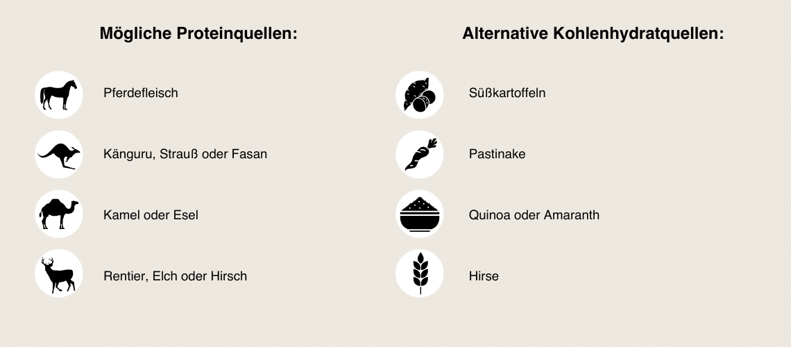 Das heißt, nach Beenden der ersten Phase werden zu den Komponenten der Ausschlussdiät nach und nach bekannte Futterquellen hinzugenommen. Das ganze passiert deshalb Schritt für Schritt, da du nur so erkennen kannst, auf welches der bekannten Futtermittel dein Vierbeiner reagiert. Also nimmst du beispielweise zunächst Rindfleisch als zweite Eiweißquelle hinzu – mehr nicht – und füttern diese Kombination zwei Wochen lang. Wird das Rindfleisch gut vertragen, kannst du eine weitere Komponente (eine Proteinquelle oder beim Hund eine Gemüse- oder Kohlenhydratquelle) dazu nehmen, die wiederum zwei Wochen gegeben wird, bevor die nächste Futterquelle dazu kommt.