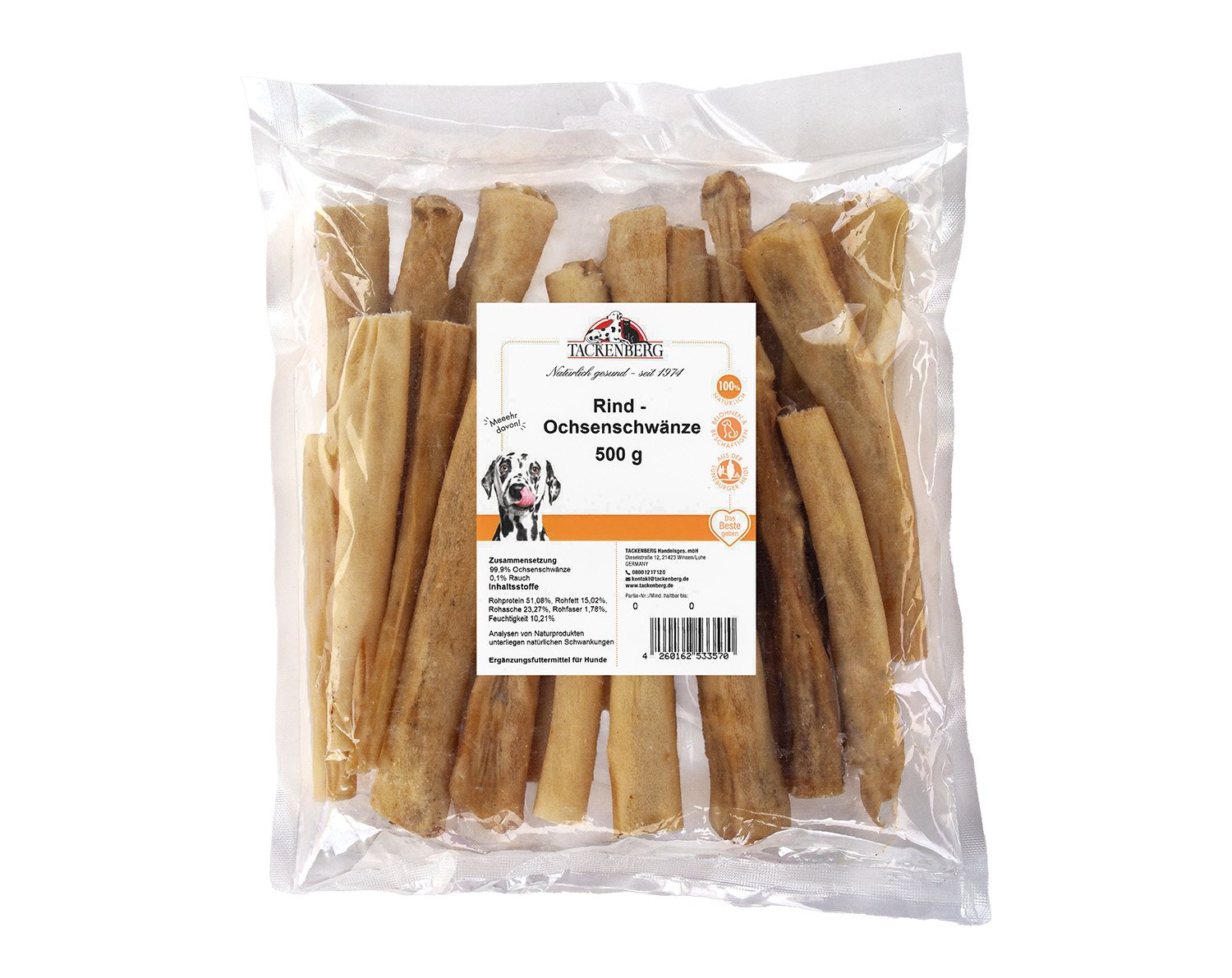 Die luftgetrockneten Ochsenschwänze sind eine natürliche Calciumquelle, die wichtig für die Entwicklung und Stabilität des Knochengerüsts deines Hundes ist. Zusätzlich dienen sie als schmackhafte Zahnbürste, die beim Kauen für natürlichen Zahnabrieb sorgt, das Zahnfleisch durchblutet und die Kiefermuskulatur trainiert.