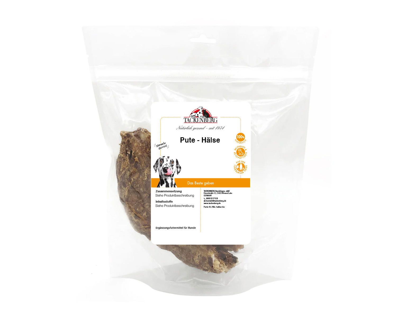 Unsere getrockneten Putenhälse sind eine schmackhafte und fleischige Belohnung für aktive Hunde, die gerne kauen. Die feinen Knochen und Knorpel bieten jedem Hund, egal ob groß oder klein, eine Beschäftigungsmöglichkeit. Das Nährstoffprofil der TACKENBERG Putenhälse eignet sich ideal für Allergiker und Welpen und trägt durch den natürlichen Abrieb beim Kauen zur Zahnpflege bei.