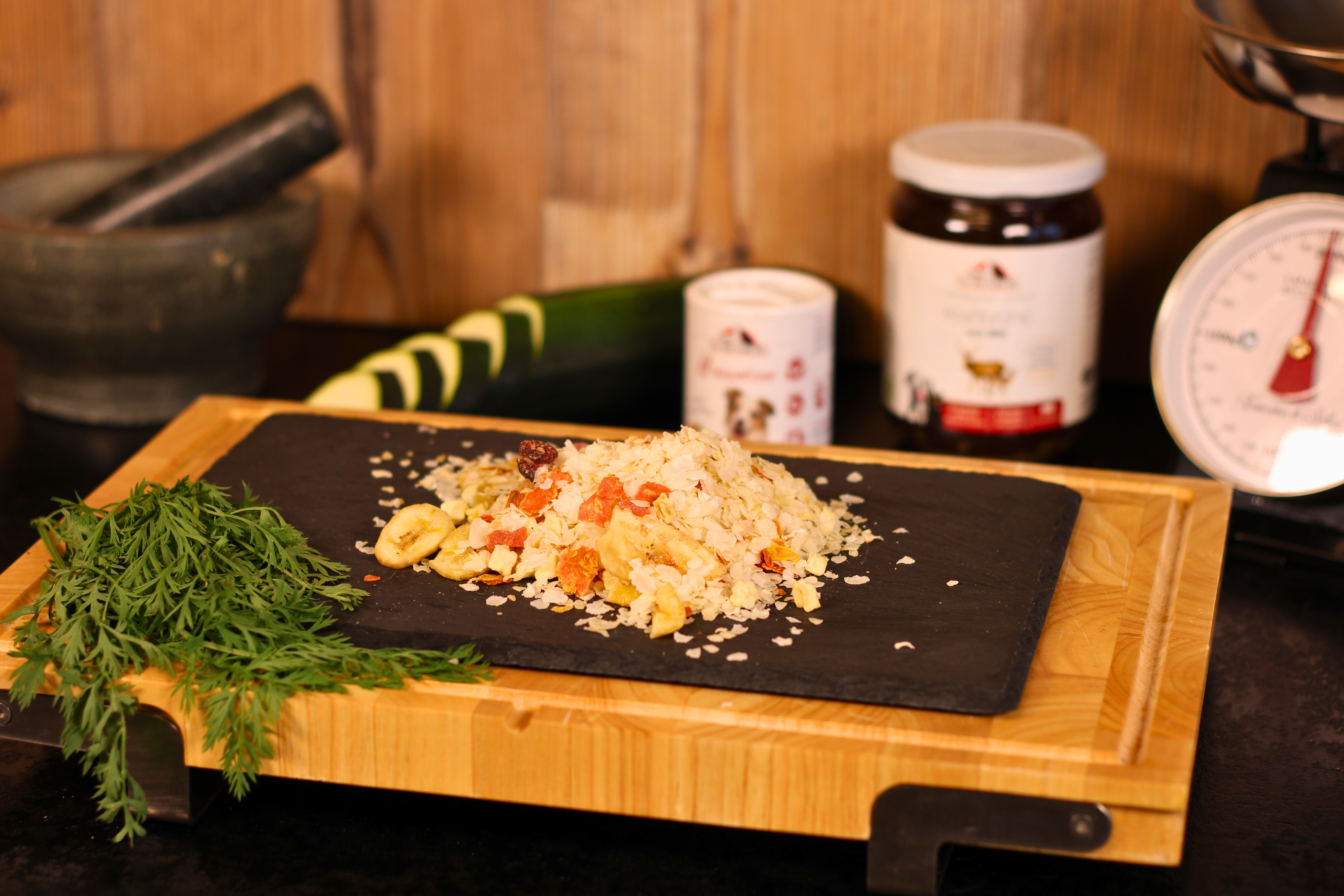 Unser Flockenmix für Hunde besteht zu 74% aus feinen Reisflocken, die mit einem Anteil von 26% getrockneten Früchten wie Äpfeln, Bananen, Papaya und Cranberries angereichert sind. Ergänzt wird dies durch gesunde Karottenflocken, die wertvolles Beta-Carotin liefern. Diese einzigartige Mischung fördert die Verdauung deines Hundes auf natürliche Weise und eignet sich perfekt als BARF-Ergänzung.