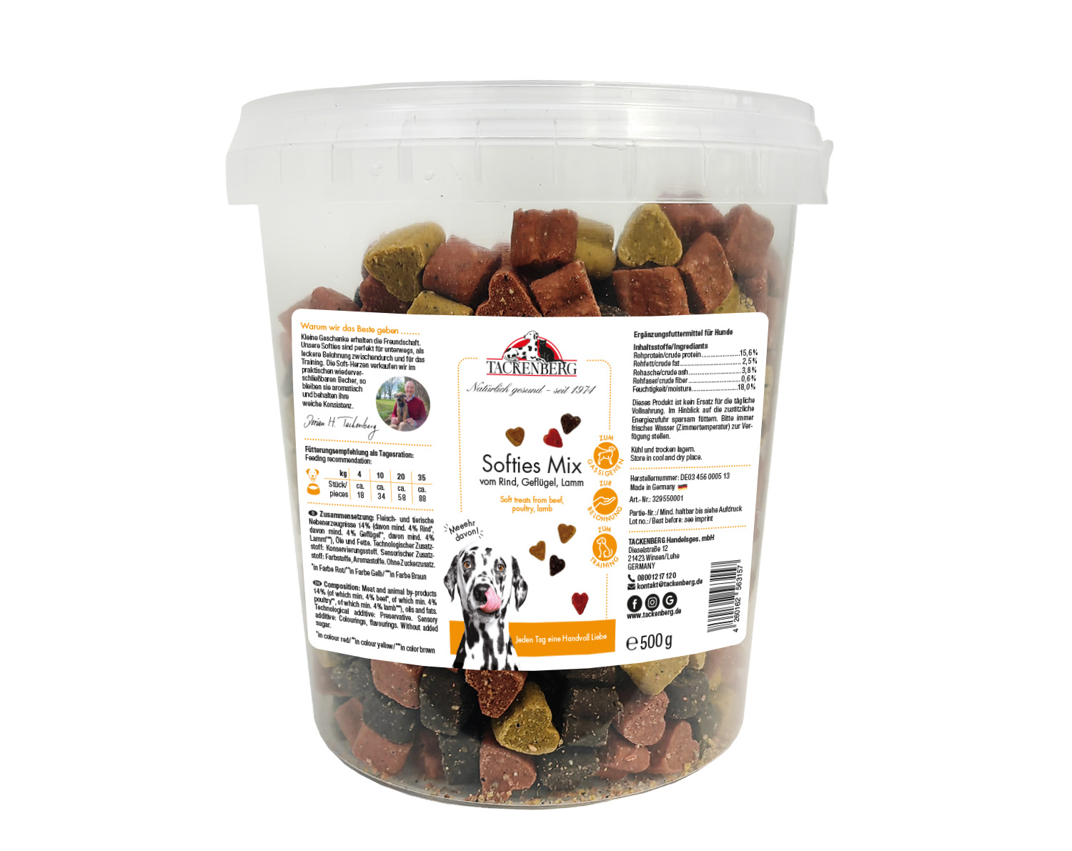 Unsere brandneuen Softies sind in vier köstlichen Sorten erhältlich und wurden speziell entwickelt, um das Training deines Vierbeiners zu erleichtern. Dank ihres besonders zarten Rohmaterials lassen sie sich mühelos zerkleinern und eignen sich perfekt als Belohnungssnack zwischendurch. Ob beim Spaziergang oder beim Training zu Hause - die Softies sind ein absolutes Must-Have für jede Situation.